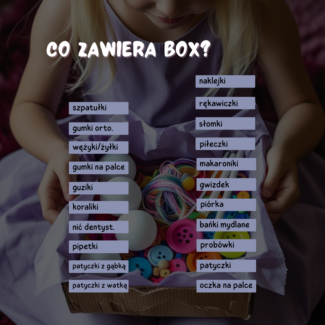 • w pudełku m.in. żyłki terapeutyczne, waciki z gąbką, patyczki, gumki ortodontyczne, słomki, pipetki, próbówki, nakładki na palce, piórka, piłeczki, rękawiczki, guziki, koraliki, nić dentystyczna, gwizdek/dmuchajka, bańki mydlane, gumowe makaroniki, naklejki, szpatułki i inne (łącznie około 120 przedmiotów).