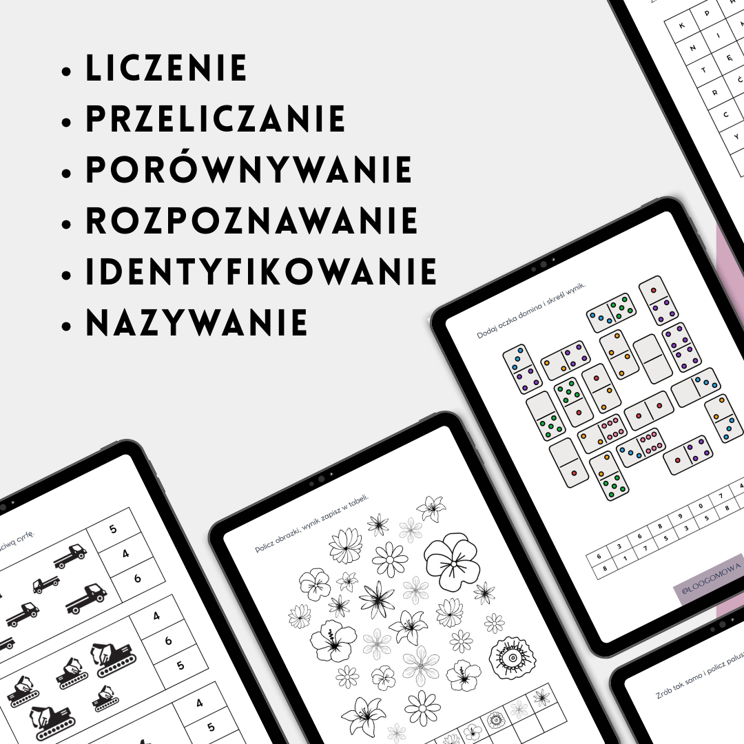 Policzajki to zestaw 45 stron kart PDF do samodzielnego wydruku, stworzony z myślą o dzieciach w wieku przedszkolnym i szkolnym.