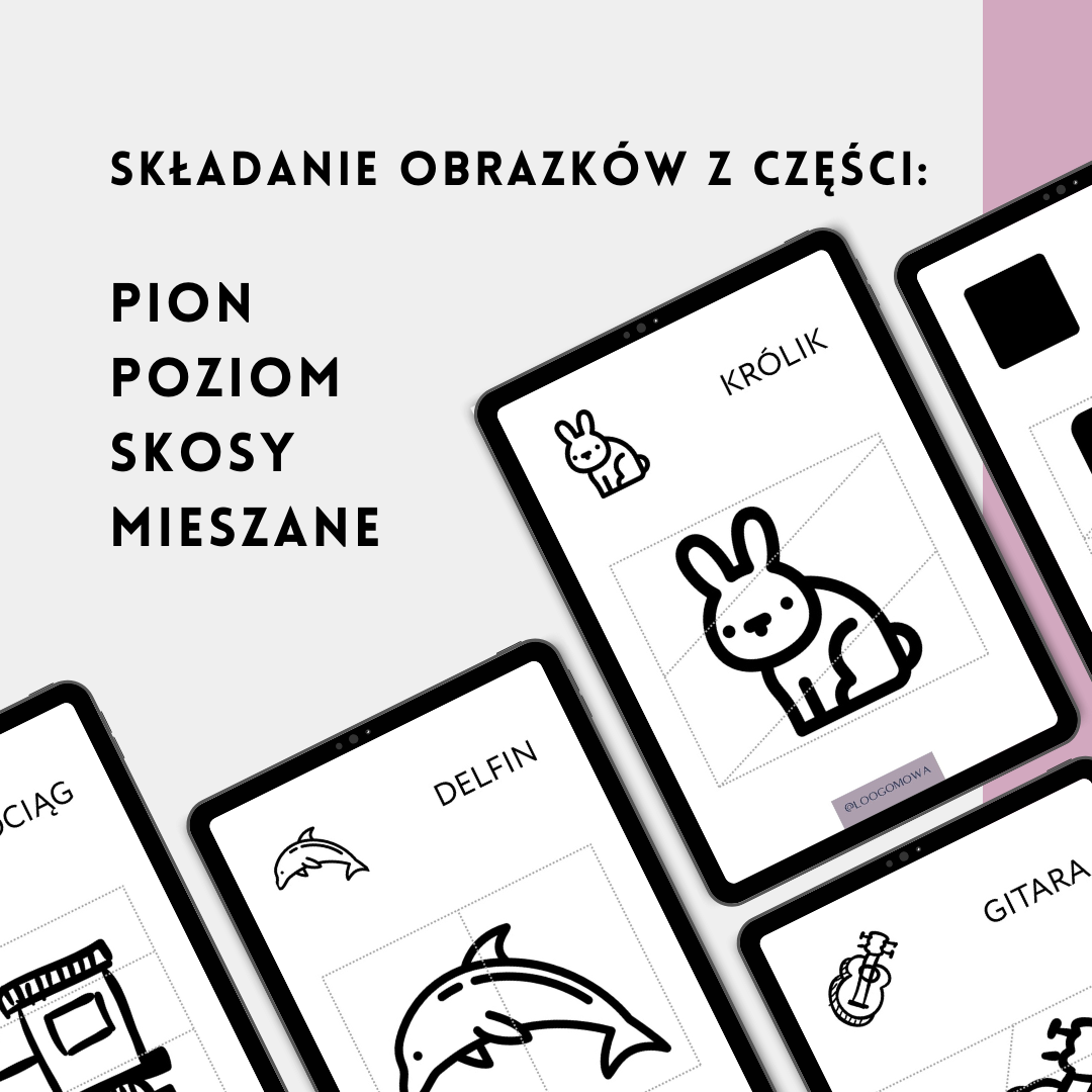 Składajki to zestaw 50 stron kart w formacie PDF do samodzielnego wydruku. Materiał został przygotowany w formie puzzli o różnym stopniu trudności – z cięciami prostymi, skośnymi i mieszanymi – dzięki czemu sprawdzi się zarówno dla dzieci w wieku przedszkolnym, jak i szkolnym.