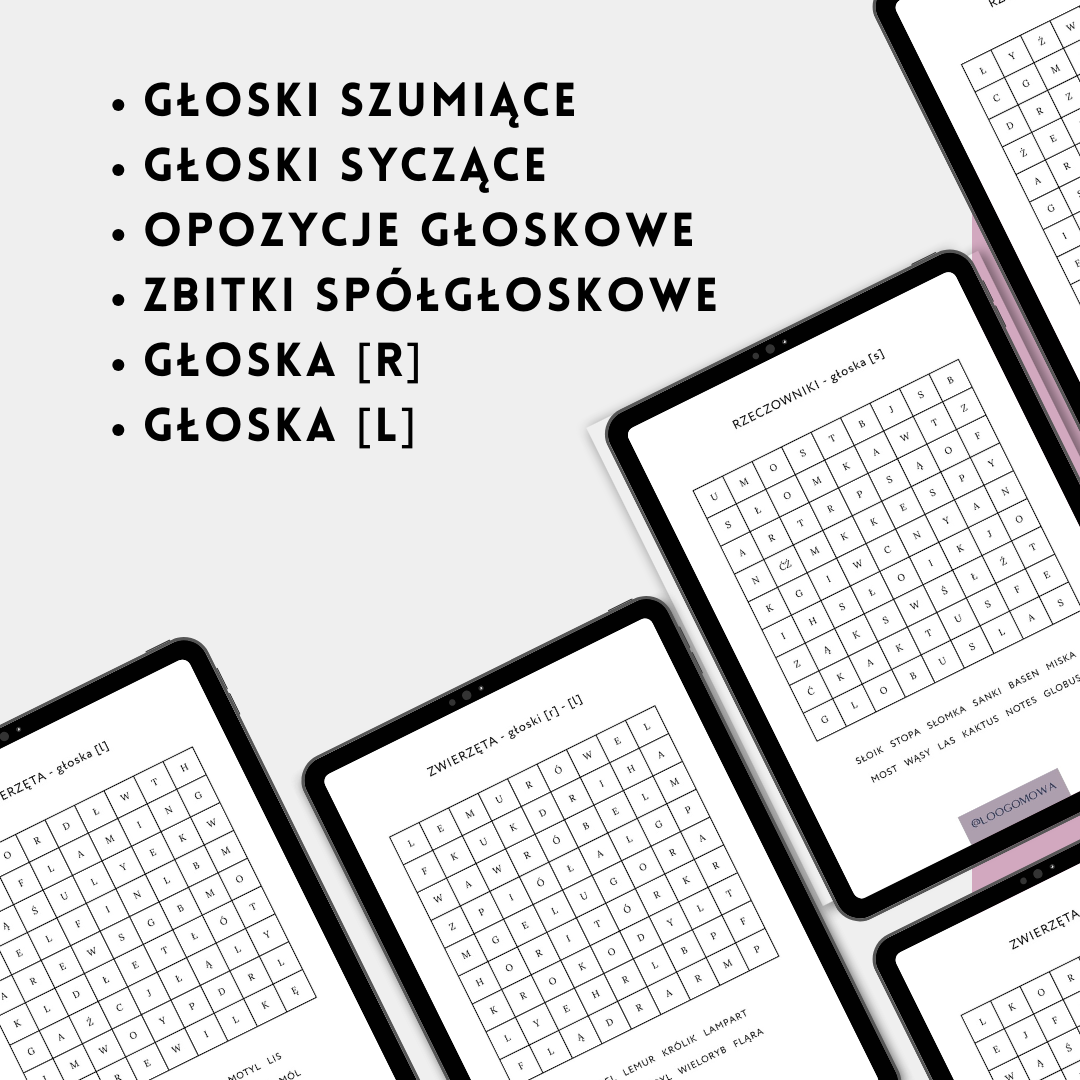 Zadania polegają na odnalezieniu wśród liter ukrytych haseł i ich odczytaniu. Taka forma ćwiczeń angażuje uwagę, uczy koncentracji i sprawia, że terapia staje się atrakcyjną zabawą.